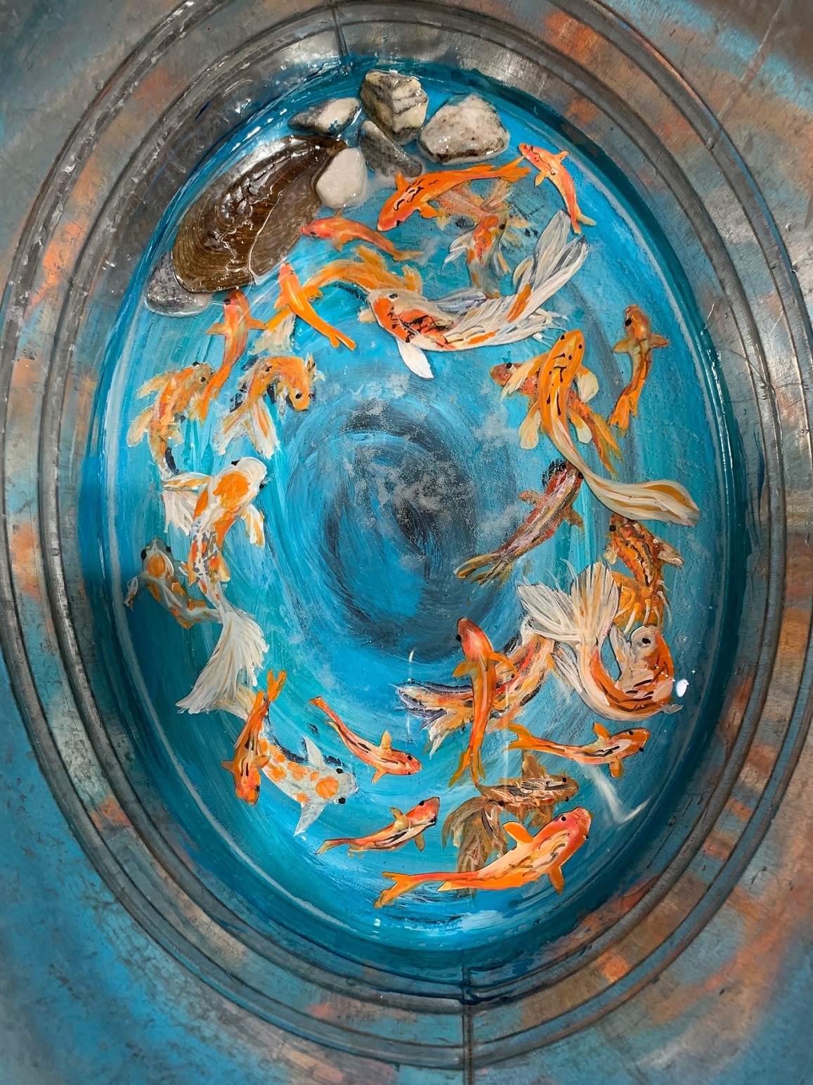 Handpainted fish under resin. |
